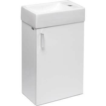 Set Jika Petit je inteligentným riešením pre tie najmenšie interiéry. Napriek svojim kompaktným rozmerom ponúka dostatočný komfort pre základnú hygienu rúk a praktický úložný priestor pre čistiace prostriedky alebo toaletný papier. Skrinka v bielej lesklej farbe je vybavená pántmi so systémom tichého dovierania a elegantnou chrómovou úchytkou. Umývadielko zo sanitárnej keramiky má otvor pre batériu umiestnený na pravej strane, čo maximalizuje využiteľnú plochu misy.
